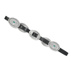 Handcrafted in Los Angeles using the finest materials sourced from around the world, this Latigo leather belt features sliding conchos with engraved filigrees and turquoise accents.