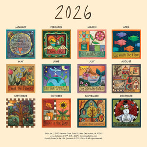As the seasons change, keep track of your schedule with our ever-popular large, 12x12" paper wall calendar featuring original Sticks Handmade artwork. - 12"W, 24"H when open - 13-month calendar - January 2026 through January 2027. - In the large, 12x12" size you know and love! Handmade artwork is created in Des Moines, Iowa.