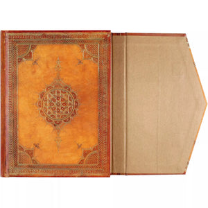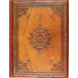 Geometric patterns and rich hues of russet and gold are embossed and embellished with iridescent highlighting.