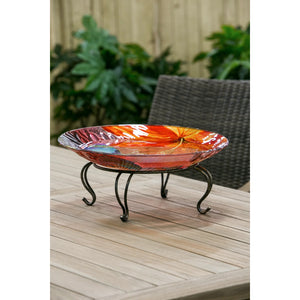 A scroll design is featured on the legs of this tabletop distressed gold metal bird bath stand. This stand was designed for our pedestal glass bird baths (sold separately). This piece can be used both indoors or outdoors when combined with a large decorative bowl.
