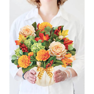 The warmth of autumn’s embrace lasts all year long with FreshCut Paper’s bold and beautiful Pumpkin Spice Bouquet. An opulent expression of sunset hues is seen in these ornately designed marigolds, garden roses, green hydrangeas, eucalyptus, red berries, and maple leaves. A nostalgic gingham bow enhances the sunshine shades, while a white pumpkin vase adds an elegant and minimalist touch. Comprised of symbols of change, renewal, friendship, and love, the Pumpkin Spice Bouquet is a gourd-ous centerpiece and charming way to send your love.