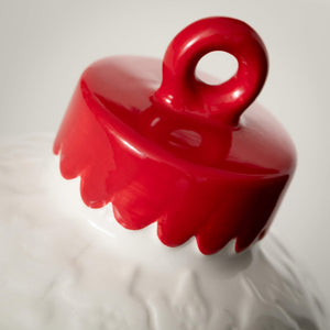This charming candy jar adds festive cheer all season long. The ornament-shaped vessel features a simple yet eye-catching red and white striped design that enhances any candy inside! Perfect for filling with colorful hard candies, gumdrops or peppermints, this decorative Christmas container invites whimsy and wonder into your home. Simply place it on a tabletop, mantelpiece or countertop for an instant dose of holiday spirit.