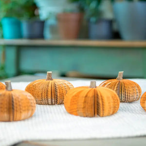 Pumpkin Dimensions Small: 5" x 3 1/2" Medium: 8" x 5" Large: 9" x 6"made from real upcycled books and feature a vibrant rustic orange color and an actual wooden stem. Book pumpkins are beautiful as a stand alone or as a set of three. Customers love to decorate with them for the fall season and into Thanksgiving. Perfect for the literary lover along with the fall decor enthusiast.