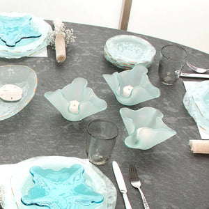 This frosted glass votive celebrates the beauty of slumped glass with free form folds that vary from piece to piece, no two pieces are the same. Looks beautiful in multiples.