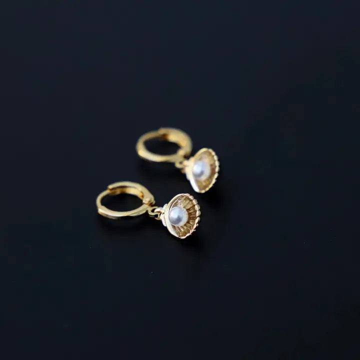 Delicate seaside shell drops with a sweet pearl center on our huggie hoops.
