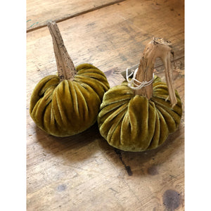 Hand dyed velvet pumpkins with real pumpkin stems.