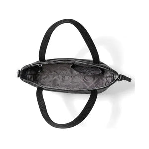 This black leather tote is the perfect size! It has an adjustable, detachable strap that allows you to wear it as a crossbody or shoulder bag. The medallion that is featured was inspired by the rose windows in cathedrals found in Europe.