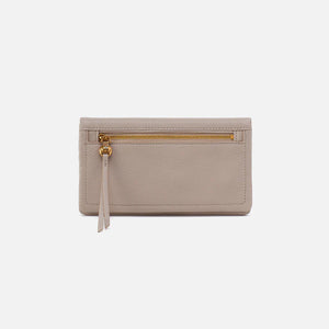 Lumen has an exterior pocket with a leather tassel zipper pull and a slip pocket for your phone, plus an interior made for all of your wallet essentials.