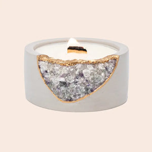 Our hand casted vessel with our signature geode look created using quartz & fluorite crystals and 22k gold leaf chrome leaf on a light grey vessel.
