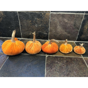 Hand dyed velvet pumpkins with real pumpkin stems.
