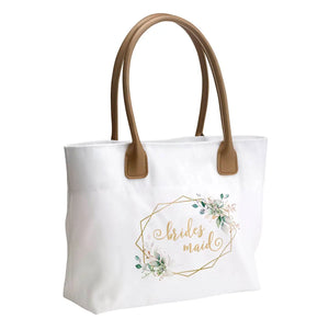 Give your Bridesmaids the gift of a beautiful botanical tote. This tote is a fun and useful accessory for parties and for the day of the Wedding. The bag is durable and is well designed, featuring a sturdy leatherette handle a on a heavy white canvas. The stylish design is a beautiful geometric and botanical print surrounding the word Bridesmaid in gold foil. A bridesmaid tote makes a lovely reusable keepsake gift for the bridal party.