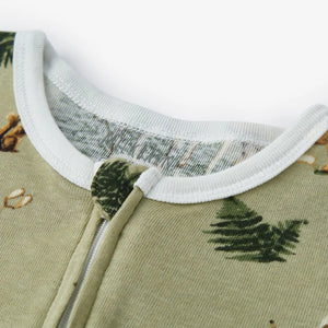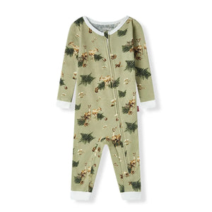 Our extra soft organic cotton Zipper Pajama in the Forest Party print blurs the lines between sleepy time, playtime, and cuddle time. The open foot detail allows our little ones greater mobility, while the midline, neck-to-knee zipper provides ease and flexibility of changing. Added details include a crew neckline, contrasting wide-band cuffs, and a stylized fabric zipper tab cover. We package all Milkbarn PJs in a reusable, corresponding fabric drawstring satchel ideal for baby essentials such as diaper wipes and up to four diapers.