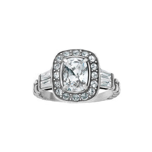A brilliant cushion-cut fine quality crystal--framed by micro pave crystals and flanked by tapered baguettes--shines with diamond-like sparkle. Its simple-yet-sophisticated design adds queenly glamour to any look.