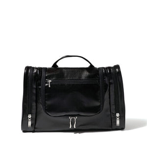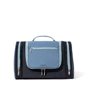 This ultimate toiletry bag features multiple exterior pockets, a space-saving hanging hook, water-resistant fabric, and clear panels for easy access. Its modular design fits perfectly in baggallini luggage, making it essential for organized travel.